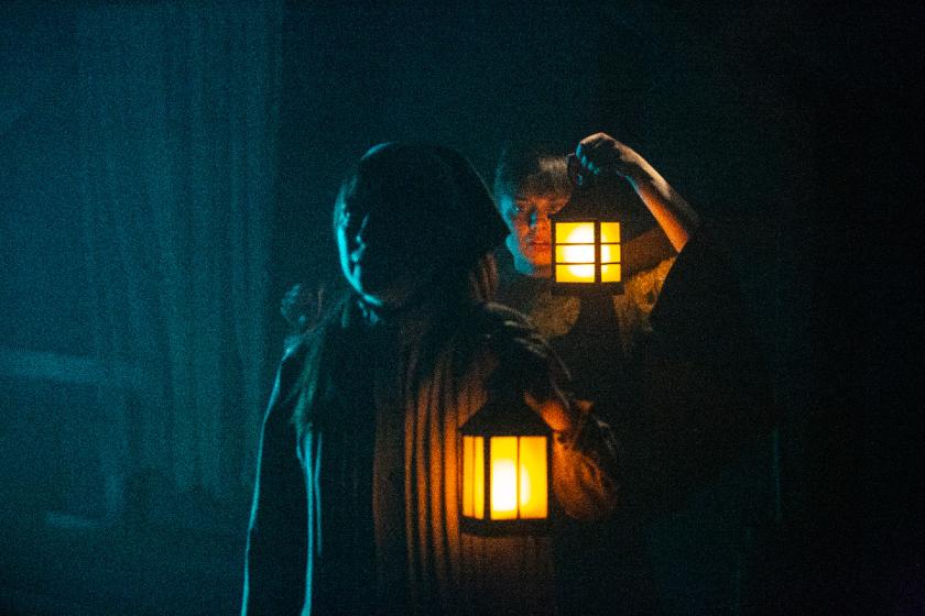 Amber Sylvia Edwards’ Mercy swaggers as she swigs cider flaunting the extra two years she has on Abigail, but her continual talk of The Devil as a real presence in the village, doing real things to real girls, speaks to the abuse she has suffered. Lydia Larson imbues Mary with an ethereal otherness, a benign companion whose apparent harmlessness is undermined by her carrying a knife and who, when she gets a chance, shows a genuine interest in what might now be called the Occult and an indifference to its threat.