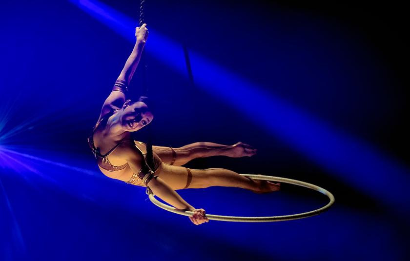 Kudos to the producers for having the audacity to look at a 100-year-old theatre and think, "Let’s get a woman attached to that ceiling by her bun." The feat of engineering required for multiple acts to swing from the rooftops (including Lea Hinz, main picture) is in itself impressive, but the aerialists are for the most part one-note – they do one thing very well, which gets tedious after 30 seconds. Hinz stands out, getting the biggest applause of the night at the end of her set, which keeps momentum throughout. She spins through the air on a large hoop and somersaults through it, toes skimming over the heads of the front row.