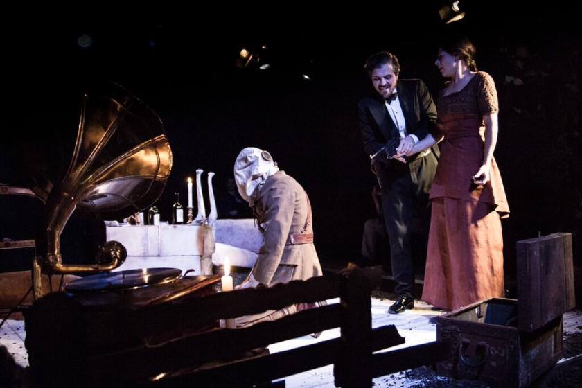His control duly dominates, setting up a second half in which the couple are forced to confront their darkest secrets: it becomes psychodrama with the refrain “No more lies” as the elegant surroundings of the opening are literally turned upside down, and the world of the trenches intrudes. Holloway gives it the structure of a forced, formal dinner, with George, whose dress from the outset has (for some reason) been black tie and tails, acting as the waiter who serves up each new course of interrogation. Dramatic tension rises, even as we, the audience, wonder just how George has come to be so familiar with the couple’s innermost worlds (his initial entrée into their lives having come when he purloined a notebook from Jane).
