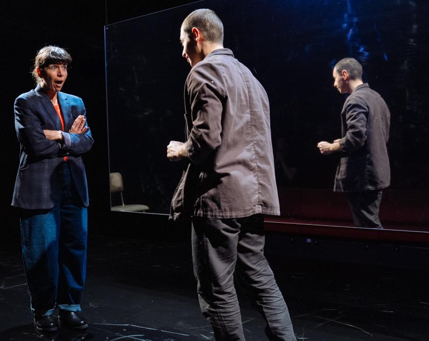 Max’s story does not end that way, but this is not a dirge-like occasion, cathartic though it may be. Hampstead is fortunate to have Eric Sirakian (pictured above left) playing Max, an actor who was in a class with him and witnessed first-hand his magnetic personality. Sirakian is neither tall nor skinny, but he has a dynamism that you can be confident Max had too, with a gleam in his eye and a way of mingling with the front row of the audience that doesn’t seem remotely performative. As Ruhl, Sirine Saba is equally convincing, presenting the author as an unshowy woman with a warm personality, great reserves of humour and intellect and a gift for friendship: a “great sense-making force”, as Max describes her.