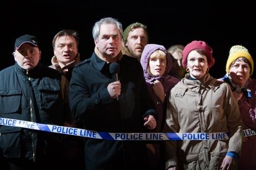 At times Cork’s score has the obsessive, repetitive elegance of a Bach fugue; elsewhere it’s jittery, jagged, and now and again it soars. Meanwhile Blythe’s text reveals a kaleidoscope of scenes. We encounter Christmas shoppers, frenetically singing “Everyone is very, very nervous” to an incongruous background piped-music soundtrack of The Most Wonderful Time of the Year emanating from an illuminated plastic Santa. Teenage girls recoil from passing men – could he be the murderer? Or him? – though one admits with a kind of giddy hysteria, “It’s exciting ‘cause nothing ever happens in Ipswich.” Blokes flinch under the prickling gaze of suspicion, or swap serial-killer theories in the pub. As the situation escalates, the London Road residents find their street full of uniforms and news crews, and in Javier de Frutos’s nimble movement direction become trapped in a strangling cat’s cradle of police tape. In their ordinary lounges, they watch the horrifying story unfold on their television screens, relayed by reporters standing outside their front doors.