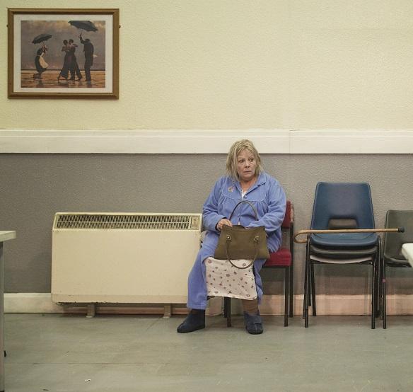 Natasha Jenkins’s set gets that atmosphere to a tee, transforming the Dorfman into the epitome of some anonymous public institutional space – sky-lights that don’t let in illumination, a back wall that hasn’t seen a fresh coat of paint in ages, its token picture the anomaly that proves the rule – the kind of anteroom you’d find in any hospital, care-home or prison. (We can only guess whether Zeldin writes with any particular physical space in mind, but the result here is the spitting image of the warehouse studio of Hackney’s Yard Theatre, where his much-lauded 2015 Beyond Caring debuted before its transfer to the National). There’s no traditional boundary between stage, such as it is, and auditorium either: the actors occasionally move out into the front rows, which are just ordinary chairs, while Marc Williams’s lighting never goes down, keeping cast and audience at the same level, varied only when characters switch lights on and off.