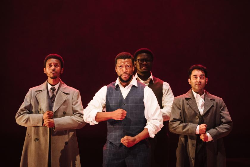 But these fleeting moments of choreographic zest, supported by Jon Clark’s densely coloured lighting and Paul Gatehouse’s rousing sound design, are not enough to salvage this deeply puzzling piece. Virtually all is caricature here, and nothing that happens on stage lands with any real force. Take, for example, the nearly parodic figuration of white characters, which include Earl Carpenter’s hazy Prime Minister and Stewart Clarke’s Warden, with whom Mandela develops an unlikely—and unexplained—friendship in prison. By the time this latter figure has experienced a complete change of heart about Mandela, conveyed in an awkward song about his white guilt, we have learned nothing about him to make this reversal either credible or even remotely moving.