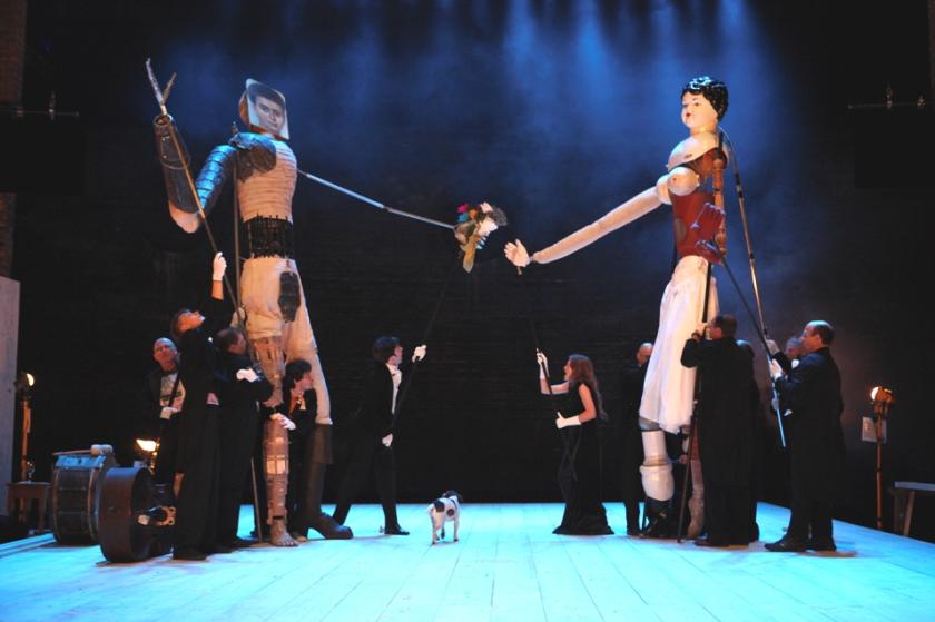 Shakespeare is clearly not going to come from the mouth of a Jack Russell, though (Venya pictured right). A very little bit is delivered, rather quietly if not downright mumbled, by selected actors (chiefly a paraphrase of Peter Quince’s Prologue, the audience reaction "I wonder if the lion be to speak" and a slab of Sonnet 18 towards the end). We are told that Pyramus and Thisbe were the ancestors of a long line of archetypal lovers dogged by a Thing (fate?), from Romeo and Juliet to Isadora Duncan and the poet Yesenin, Tchaikovsky and his coachman (that must have gone down well with the Russian culture minister Vladimir Medinsky's assertion "there is no evidence that Tchaikovsky was a homosexual"). The well-dressed "audience" assembles, brushes off the sawdust from the balustrades or showers it down on their neighbours; about 20 minutes in the giant Pyramus with a Helleno-Egyptian painted boy’s face – later to morph with suicidal grief into a bearded man - and Thisbe with an outlandish doll’s head and big breasts lumber into life thanks to the manipulations of ten participants.