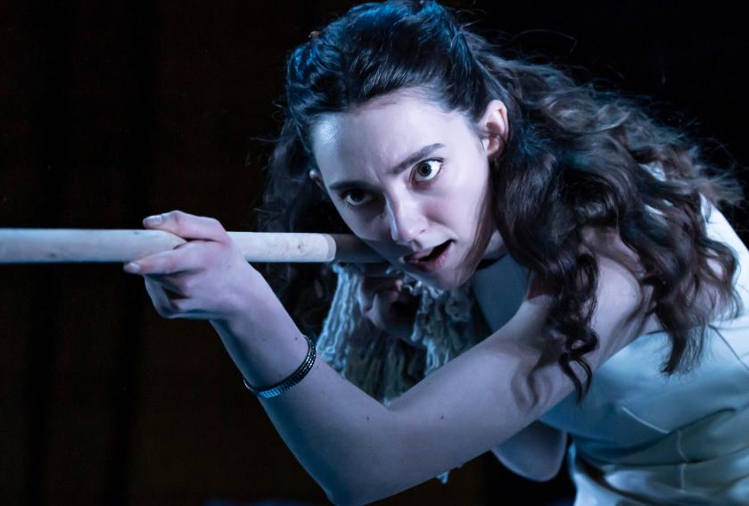The tone of the production is knockabout farce, fuelled by the mocking sounds of an on-stage cellist, (Miriam Wakeling), who can niftily move from melodrama to melody via a Hendrix-like raunchiness. Reynolds is the main source of the comedy. Her every look and gesture can raise a laugh, from adjusting her bodycon wedding dress in the first scene to her robotic play-reading skills and presenting of arms (Mei too was in the army, in the artillery) with a mop.