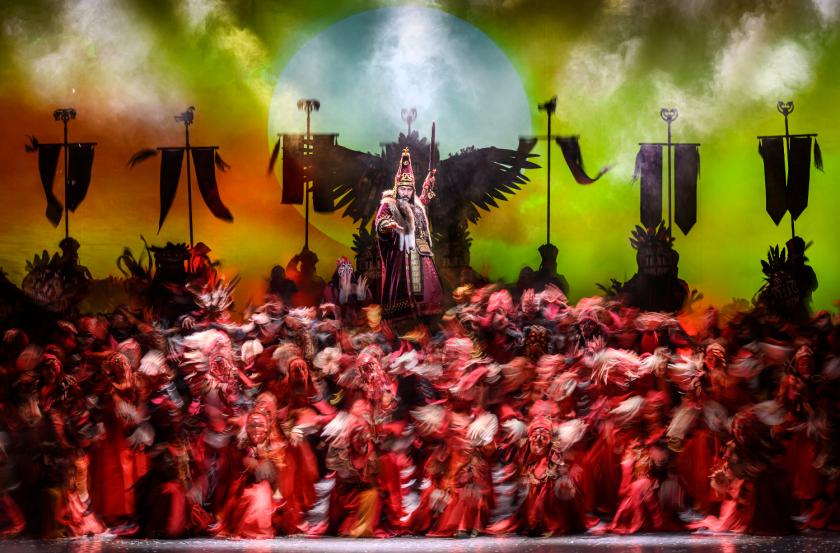 A chorus of some 50 or more dancers, bedecked in an extraordinary wardrobe of costumes (by Bold Ochirjantsan) the colours, weight and movement of which conjure the Steppes in one’s mind’s eye, flooding the vast space with movement. Many act as the outward expression of the inner soul (think dæmons in Philip Pulman’s His Dark Materials), but, despite their often agonised writhing and violent intentions, they never lose the grace that suggests they’re lifted by the winds blowing over the vast cold plains of their homeland. Choreographer, Bayarbaatar Davaasuren, marshalls his troupe with pinpoint precision, but always in service of the narrative and, even more importantly, the mood that buoys it. You can see every penny of the ticket price on stage in every minute of this show – not something one can say too often these days.