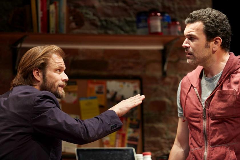 What ensues across nine scenes (no interval) is a round-robin of shifting affections and allegiances that spirals out beyond this sparring duo to take in a second combative couple, Jackie's sponsor Ralph (Newman) and his envenomed wife Victoria (Nathalie Armin), as well as Jackie's fluttery yet fierce cousin, Julio (the priceless Yul Vázquez, the cast's lone hold-over from New York): an apparently pansexual health-food hipster who is no stranger himself to talking the talk. How often have you heard "Van Damme" used as a verb (Vázquez pictured above)?