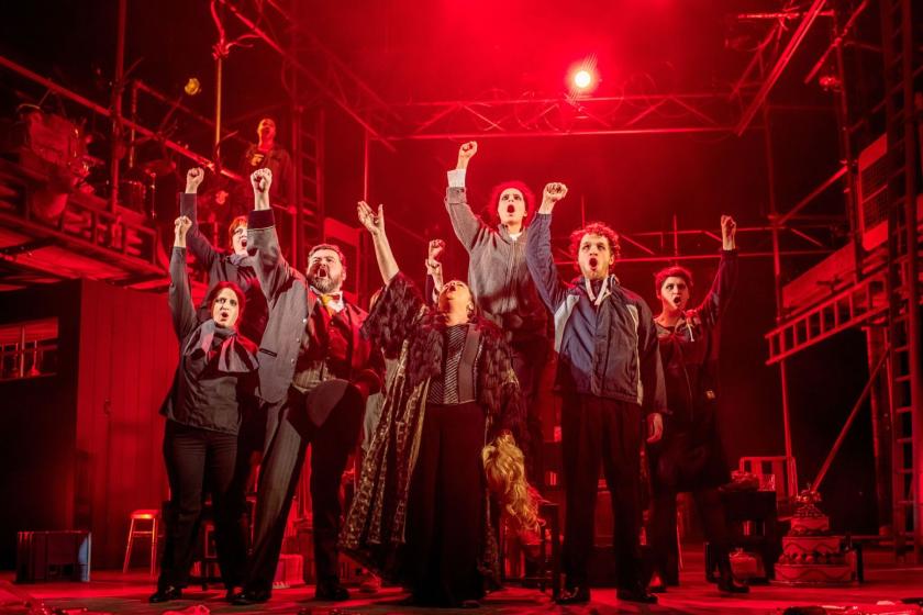Murat Daltaban’s production doesn’t help: Brechtian to its core – the seams and stitches are there for all to see – but never very funny. Tom Piper’s set shows an enormous scaffold, onto which backdrops and drapes are unceremoniously hung. Props are very obviously props, and actors very obviously actors. The fourth wall gets razed about thirty seconds in. “There’s a costume change going on, I won’t lie to you,” explains McNicoll’s Matti, during a long delay in which he simply sits reading the paper. “And we thought honesty was the best policy.”