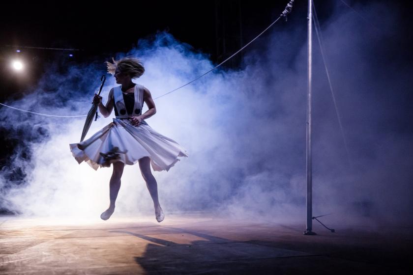 It should be added that the word “clown” is used to encompass the skill set rather than any It!-style figures with white face-paint and red noses. Chief among these is a wildly curly-haired fellow in braced-trousers (to my shame, I’ve no reference programme to tell you names) whose energized antics are vitally dynamic, especially when clambering and flipping up and down a tall steel pole in the most outrageous, dangerous-looking fashion.