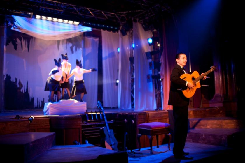 However, amid this cultivated faux-Frenchness, two things are absolutely for real about this production, and together they make it a high-class evening: the dominant role which the company and its director Alexander Scott have thoughtfully given to music, and the versatility of the Little Bulb troupe as actors-singers-instrumentalists. To describe them as actors who play instruments and sing doesn't begin to do them justice. I found myself wondering what "occupation" they all put on their passports
