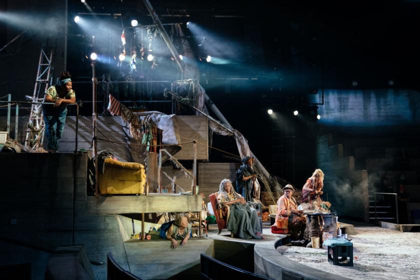 The original Philoctetes was trapped on Lemnos, whose more recent history as a refugee landing ground finds various references across the stage and throughout the text. The chorus talk about being stuck in camps because they haven’t got any papers; Odysseus stole the documentation that would get Philoctetes back home. Tempest’s unnamed island has been sold out by its government to a prison company, so the women of the Chorus have nobody to rely on but each other. They roll their eyes when Philoctetes finally deigns to speak to them after a decade of living on their doorstep, but they’re still kind to him.