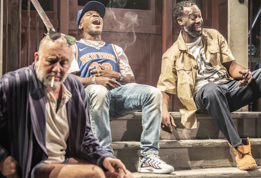 Into this mix McCabe throws a third purist: Gerry (Jasper Britton, pictured below left), except he’s white, a generation older than Lamont and Bugz, and his religion is the classic Broadway musical. While they play vintage hiphop out on the stoop of the building in Queens, NY, where he and Bugz live, Gerry is upstairs singing along to The King and I, the highly appropriate “Getting to Know You”, which has to bow to Public Enemy’s “Shut ‘Em Down”, blasted out on the combined forces of Bugz’s iPod and Lamont’s old beatbox outside.