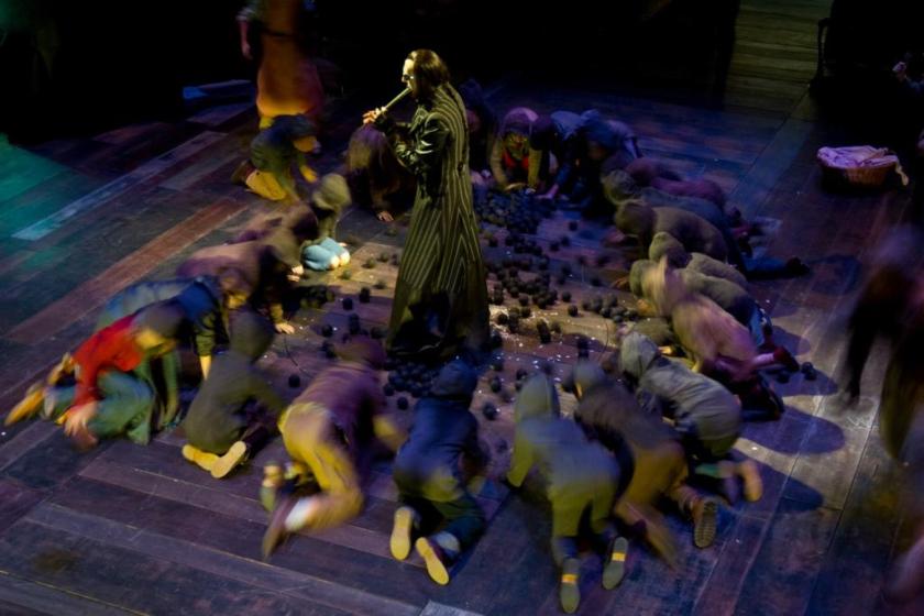 It kicks off with a fairly straightforward take on the old Ratcatcher, where the community, led by a duplicitous politician (giving rise to some contemporary digs), rat on the piper (Michael Mears, pictured below), causing him to whisk the children away. The last version of this tale I saw was the nightmarish but spine-tingling take on the story by George Benjamin and Martin Crimp in the acclaimed one-act opera Into the Little Hill. There the Piper rids an ungrateful community of the rats, but takes the children off into a “little hill”.