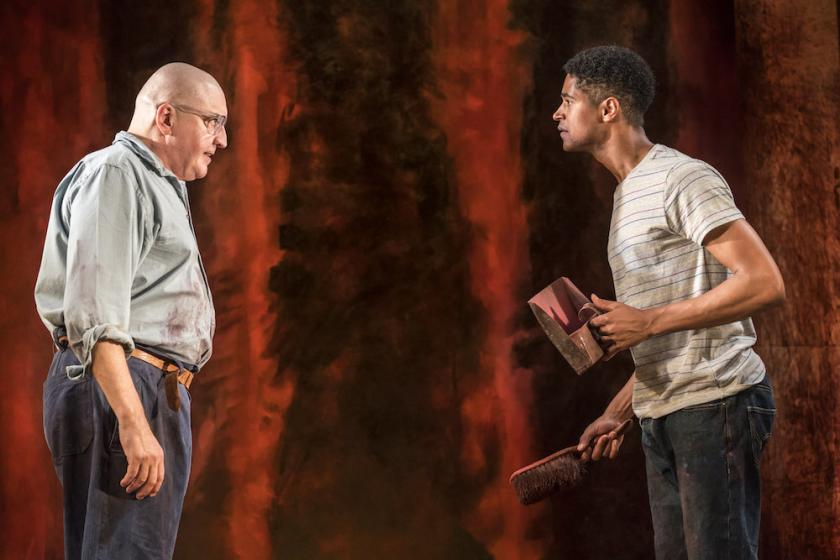 As expected, Logan’s piece is teeming with ideas, but a surprising pleasure is the physicality of what otherwise might feel like a one-on-one tutorial. In Christopher Oram’s spectacular re-creation of Rothko’s studio, a cavernous former gymnasium, we see not just the finished thing, but also hues being mixed, canvases stretched and hammered into frames, giant paintings hauled on pulleys, and – in a bravura, dance-like sequence – the duo rigorously priming a canvas by applying a base layer. (Alfred Molina and Alfred Enoch pictured above and below)