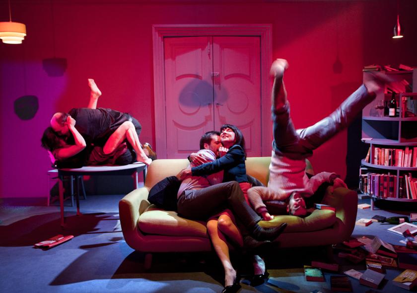 As the evening advances, Toupin shows us the forbidden thoughts of all the members of the two families, and escalates the scenarios through a series of power games, in which desire and suggestions of desire snake through the conversations like some weird yet familiar subcutaneous serpents. Sex, seduction and sensuality soak through the action like liquid seeping deep into a paper napkin. Then, by contrast, there are moments of freezing rejection and episodes of awkward non-communication. It’s like watching Pinter drunk and dizzy on red wine. Lots of red wine.