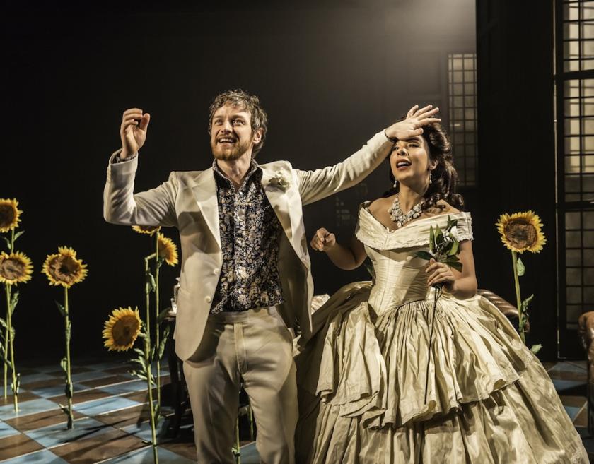 Unencumbered by Peter O’Toole’s memorable Jack from the 1972 film version, McAvoy highlights the play’s pluses, its brilliantly madcap humour and a novel depiction of mental illness. The star’s physicality is immense, whether he’s preening beautifully in his bohemian lordship’s white suit, bouncing topless upon a giant cross (merely for posing purposes), riding a unicycle, leading the cast in a song and dance rendition of Dem Bones, or bounding around the stage on his haunches, having declared, “You’ve turned me into a wounded dwarf.” His hand movements alone are worth the price of admission.