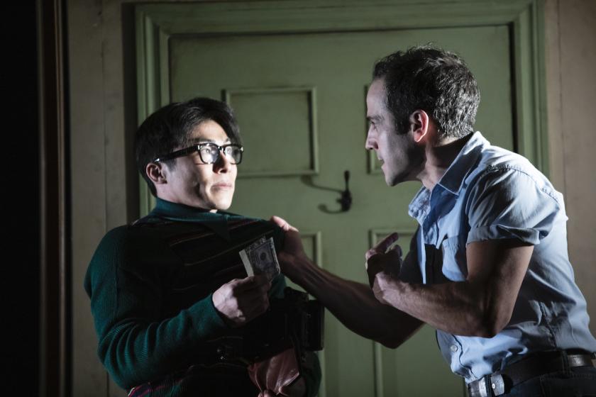 The interweaving of the American Jeffrey and Japanese Jeffrey’s lives forms the backbone of a series of stories that take us from Hiroshima in the Forties to New York in the Sixties to Amsterdam in the Eighties. Then the action circles back to Hiroshima in the same decade, before rewinding to Osaka in 1970 and then leaping forward to Hiroshima in the Nineties for the two final scenes. Each scene features different theatrical devices and tempos: where the opening scene is a stunningly serene exercise in the interplay between shadow and film, the second scene – in New York – gives us a hilarious hustling Rear Window-style portrait of a hip community struggling to get by in a down-at-heel apartment block. In yet another scene we watch snippets of a Feydeau farce as if we are seated backstage, before the action is flipped round and we see the starring actress become involved in her own Feydeau-style farce when she sleeps with a dignitary who has been in the audience.