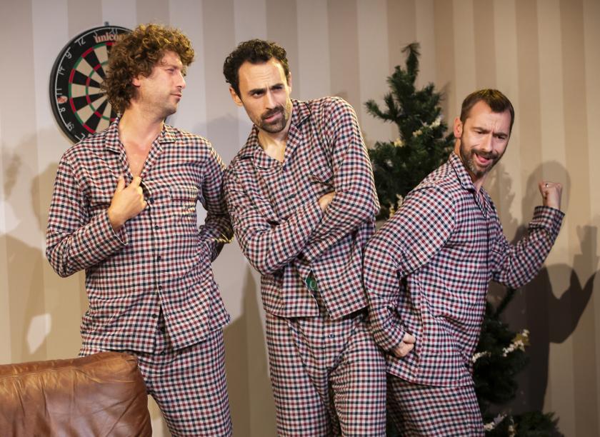 Once the glitter twins and their hiphop party-tape have exited, we are squarely in the Midwest, in a typical brown man-cave with a leather sofa and family photos on the wall. Enter the first two white men, pulled in as if by invisible ropes and jerking like string puppets that slowly come to life. These are brothers Jake (Alex Mugnaioni) and Drew (Cary Crankston), visiting the family home for Christmas inhabited by their father Ed (Simon Rouse) and older brother Matt (Charlie Condou). Jake, a twice-divorced banker, is playing a videogame on an Xbox that turns out to be his Christmas present to his dad. We can see at once who the gift is really for and who Jake is.