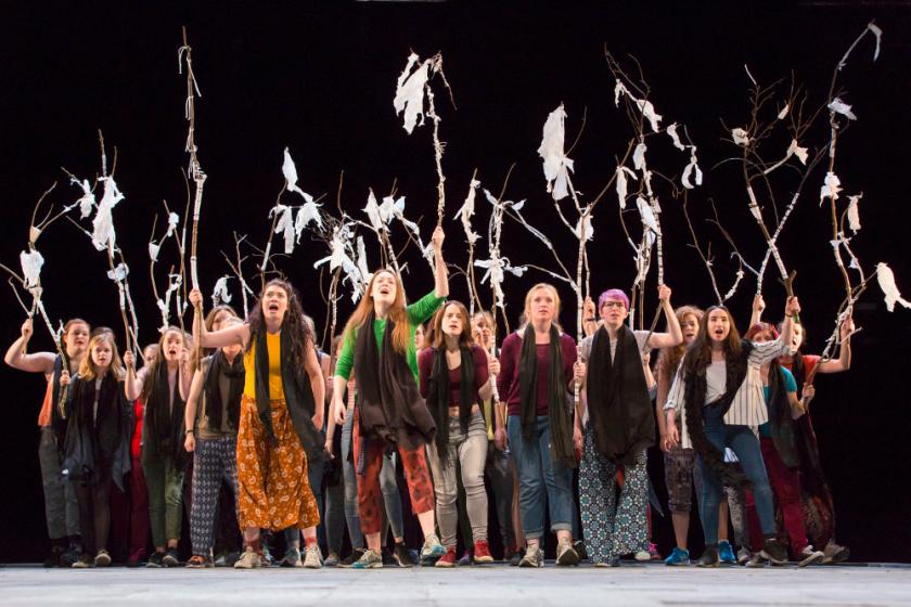 With all of these different elements, however, there’s also the feeling that there might be simply too much going on. With nods to ancient theatre rituals, contemporary resonances, community performers, and issues of women’s rights, Greig and Gray offer such a sack of thematic richness so bulging that it’s sometimes difficult to see where the focus lies. And in fact, those themes and conceits tend to pull in different directions, rather than coalescing as a single intention. Brown’s all-pervasive (or almost) score doesn’t help: in restricting Greig’s text in its tempo and rhythm, it often detracts from the words’ expressive suppleness, so that rare moments of unaccompanied spoken dialogue come as a refreshing break from what feels like quite an incessant, unchanging texture.