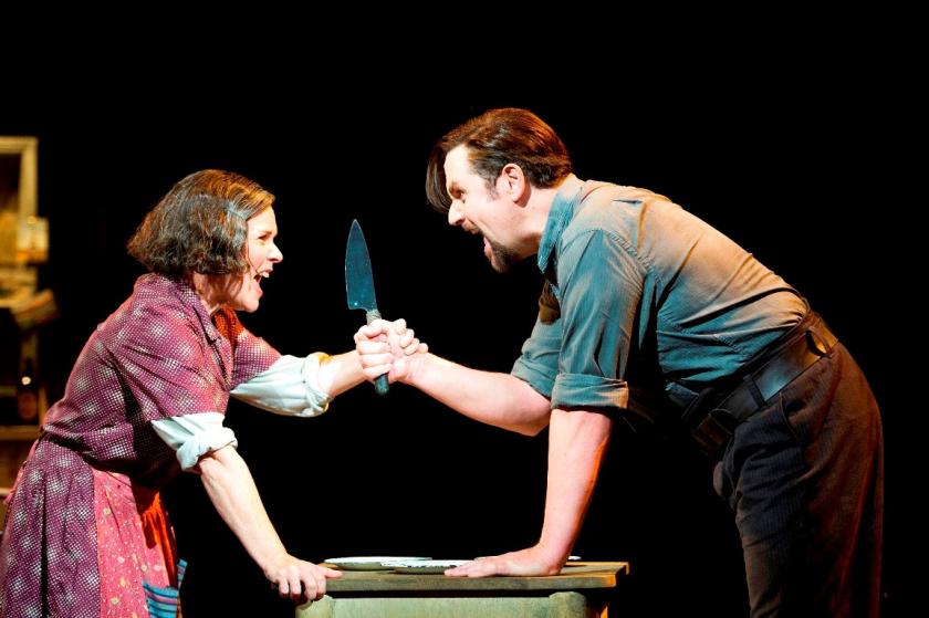 But ultimately, any Sweeney boils down to its leads. Michael Ball (pictured above right) has performed in Sondheim pieces before, most notably in Passion, that curiously film noir-ish hyper-drama. Sweeney is, however, a different kettle of mayhem. In Passion the hero is acted upon, pushed around by a psychopath until he succumbs. In Sweeney, Sweeney is himself the psychopath, the actor, not the acted-upon. And Ball, while he does well enough, is ultimately just not big enough – not big enough psychologically, or of voice, or of sheer physical presence. (He also, for reasons I cannot fathom, sings “American” – his speaking voice is pure Brit, but he drops into transatlantic-ese the minute the music begins.)