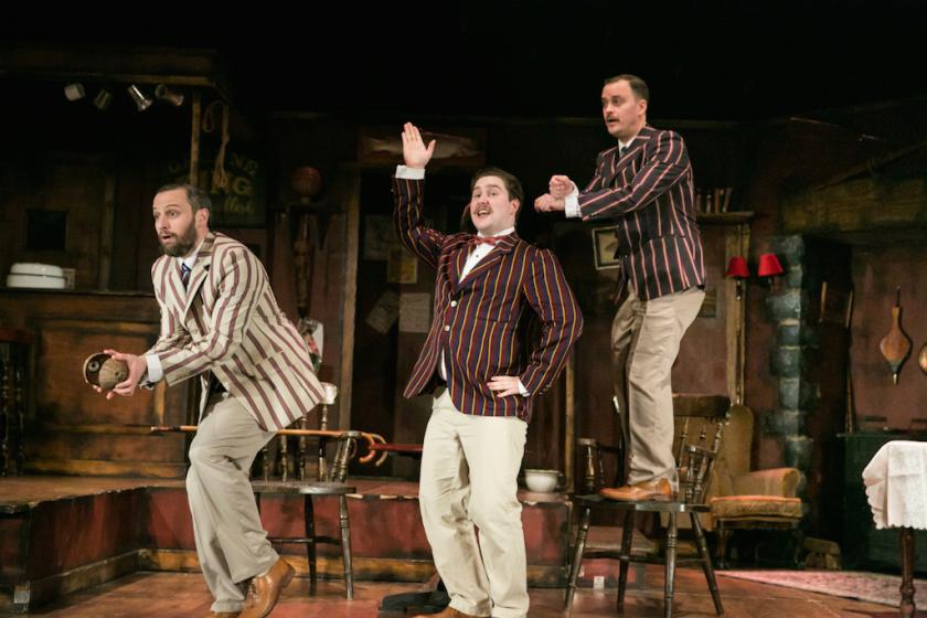 The striped blazers, overgrown schoolboy indolence, and the constant practical joking on each other, all make for tight, daft, slapstick theatre in this four-hander for the three chaps and a stray female pianist who is apparently in the wrong place at the wrong time. That the accent will be on physical theatre comes as a surprise from the start, seeing the richly detailed but cramped interior of The Elusive Pelican, a beat-up little pub relishably designed by Victoria Spearing. You wouldn’t think there was enough room. But as the friends recreate their watery expedition, hauling chairs, tables, hampers into service as props for their mishaps, their routines are all the merrier for the precision needed for these nightly pratfalls.