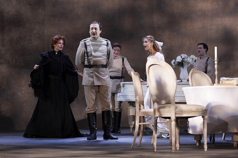 The players dashed on for their scene, rushed around each other animatedly as they conversed, and strode importantly to front of stage to deliver their reflections on life to us. More like grand opera - as if roles had been preformed and the actors instructed according to their ranking, rather than developed from inside genuine human psyches: Chebutykin as a comic-book old drunk was a particular bore (RIP Cyril Cusack), and the capricious missishness of Alyona Babenko’s Masha made her character very difficult to like or believe in. Sergei Yushkevich's Kulygin was not so irritating a husband as to make the pompous Vershinin of Vladislav Vetrov impossible to resist.