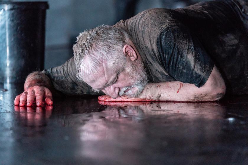 The next moment we’re in flashback – the light changes, the jeans-and-t-shirt-clad cast are moving around the stage, and Richard is adjudicating the argument between Mowbray and Bolingbroke that will eventually spiral into rebellion against his reign. Against Ultz’s industrial container-like set – lined with buckets variously labelled as containing "blood", "soil" and "water" – Russell-Beale’s Richard sets out his passive-aggressive stall, clearly enjoying the men’s animosity towards each other at the same time as he capitalises on it.