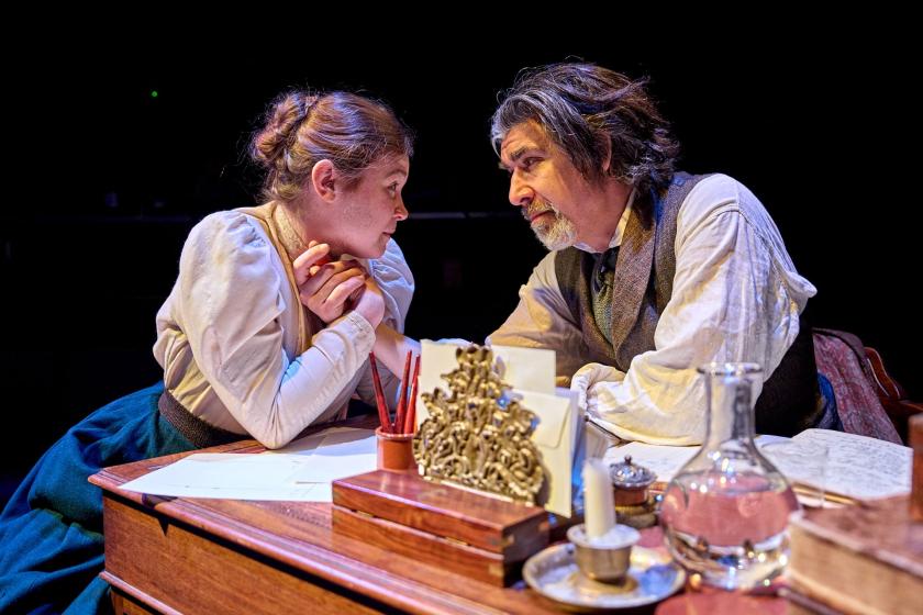 By way of example, barely has Astrov (Andrew Richardson), the charismatic if intensely self-critical doctor, arrived on the scene before he confesses an inability to love which bodes ill given the ripple effect he will send out towards the two central women in the play. Those are Yelena (Lily Sacofsky, pictured below with Richardson), the ringleted young bride of the ageing, gout-afflicted professor (Wiliam Chubb), and the ever-patient, indrawn Sonya (Madeleine Gray), the 22-year-old niece to the eponymous uncle (Ted Lasso Emmy nominee James Lance) who might well take his own life – if only he could get his gun to work.