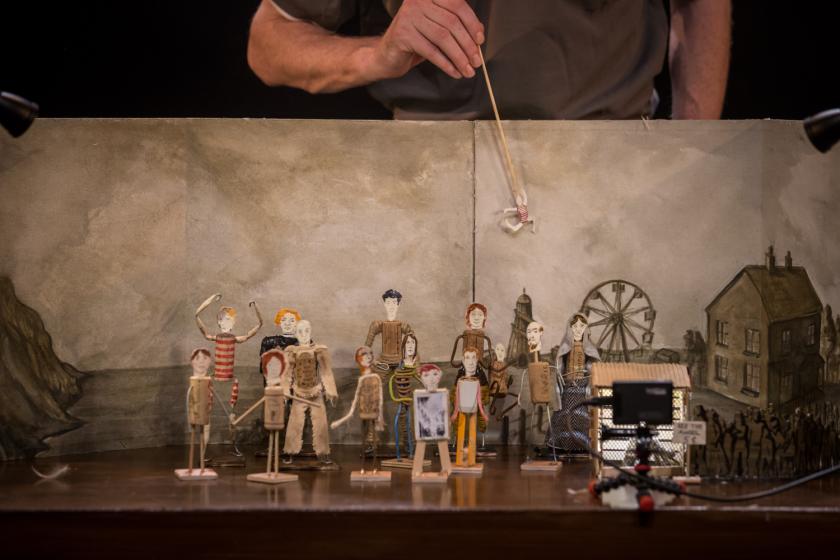 Dan Colley’s retelling of Gabriel Garcia Marquez’s tale A Very Old Man with Enormous Wings consists of two storytellers, a kitchen table and a cast of tiny figurines in front of a cardboard set. The pair inform us that “we tell the story because we like it” and issue a warning that “there is no lesson, so don’t go looking for one.”