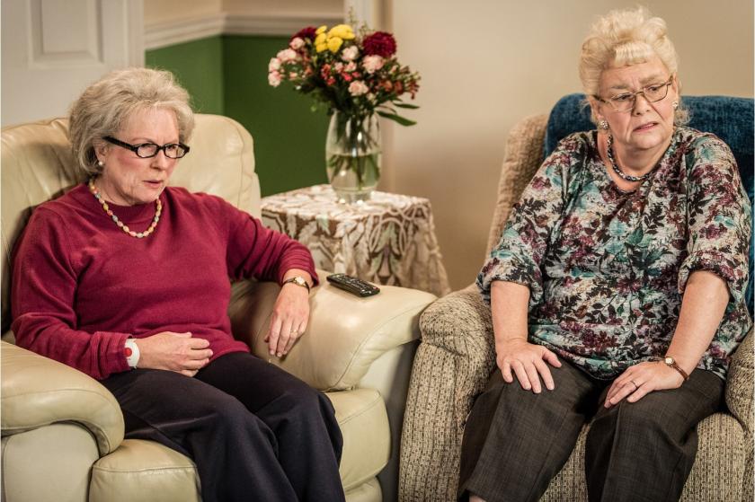 Among the new sketches we returned to Prickly Pear Farm, where Dot and May are now running a hilariously inadequate natural burial site, and visited the Poldark set, where they played two irritating extras (pictured below with Poldark's Eleanor Tomlinson and Jack Farthing), forever asking for selfies with the cast. The pair also played two old biddies on Gogglebox blathering on about “Clara” Balding and other gay people on TV, and provided a pitch-perfect skit about the real Giles and Mary who appear on the reality show.