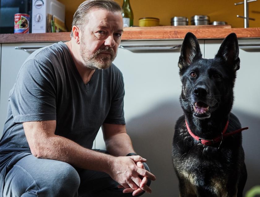His misanthropy arrives at a logical terminus in After Life (Netflix), a sitcom about suicidal depression. His protagonist Tony is a middle-aged local journalist who has not coped since the death from cancer of his wife Lisa (Kerry Godliman, pictured below with Gervais). She has left behind inspirational video messages to get him through the day but they don’t seem to be working. He eats curry from the tin, barely bothers to do any work in the office, and often discourses on the pointlessness of existence. “A good day,” he explains to new colleague Sandy (Mandeep Dhillon), “is when I don’t go around wanting to shoot people in the face and then turn the gun on myself.” The only thing preventing him from going through with it is his German shepherd Brandy.