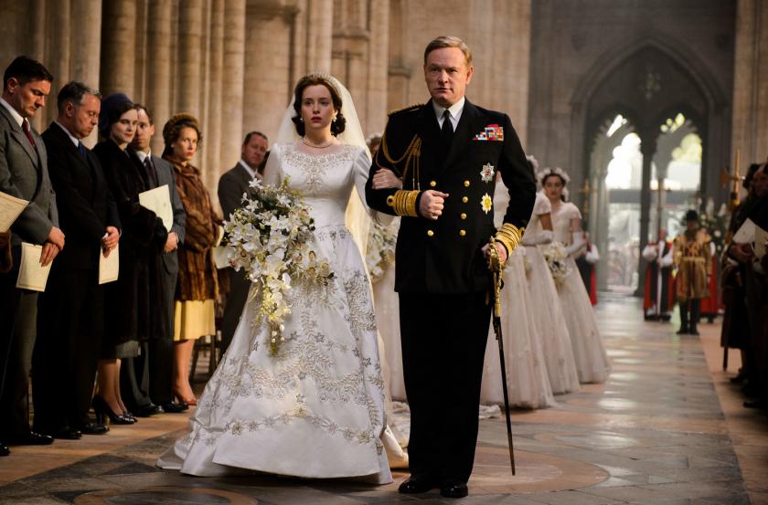 Even at this premarital stage, Philip seems conflicted about his future role. His manner is sulky, his body language restless. Elizabeth herself doesn't seem entirely certain either. "You still have 24 hours to change your mind," she tells him nervously the day before, and in the middle of the ceremony in Westminster Abbey she freezes at the line "to have and to hold".