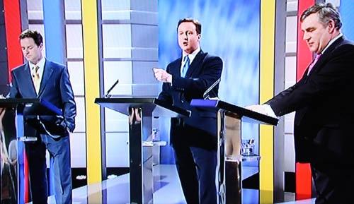 The way the pundits were jumping up and down hailing a historic night in British politics, you'd think nobody had ever seen Nick Clegg, David Cameron and Gordon Brown on TV before. This, we were told, could be a historic 90 minutes that would transform our nation's political discourse. "The leaders' debate will be a direct confrontation with the voters that could change the election", according to a man wearing glasses in The Times.