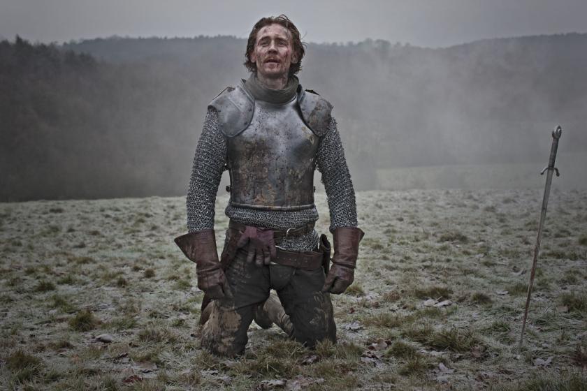 Sharrock comes at the play in an altogether different way, and not only because Ben Power's extensively cut (the Scroop/Grey subplot is gone), re-ordered adaptation frames events with the funeral of the warrior-king, Henry, who, we are reminded, died of dysentery in 1422, age 35. (Well, he at least outlasted poor ol' Richard II by two years.) The prevailing tone is evident from the slowly spoken, sepulchral sounds at the start of John Hurt, who plays a (mostly unseen) Chorus, only to make a fleetingly sad-eyed appearance at the very end. On stage, this character serves to invite us to open wide our imaginations; on screen, he's our shivery guide toward the grave, a destination that Henry and his entourage (pictured above) will come to know all too well. (He's also here presented as a witness to history via a cunning surprise that threads the character, if not Hurt himself, throughout the action.)