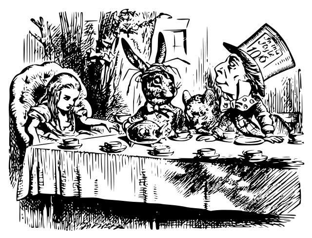 Alice is always with us; the most quoted work of literature, after the Bible and Shakespeare. In fact, Desert Island Discs should probably add Alice to the mandatory Bible and Shakespeare as an automatic inclusion for the survival kit. Now 150 years after the publication of Alice’s Adventures in Wonderland, written by a celibate mathematics don at Christ Church, Oxford, real name Charles Lutwidge Dogdson (pictured, below right), there are translations into countless languages, including that of the Australian aboriginals, who historically did not even have a written language.