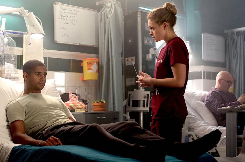 Front and centre, though, is Corporal Jamie McCain (Alfred Enoch), who’s been brought to the neurological unit of South Lothian hospital after suffering a spinal injury during a shoot-out in Syria. He’s currently in the “spinal shock” phase (in medic-speak), which has left him with paraplegia, though with good prospects of making a full recovery. Understandably, he’s taciturn and somewhat depressed. The neurotic chatter of fellow-patient Danny Adams (Elliot Cooper, pictured below) is doing little to brighten his mood.