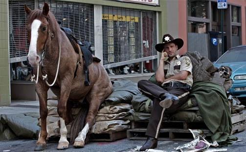 Nevertheless, the notion of being trapped in a petrified wilderness where you can’t even find a wifi network for your iPad and the only people you meet are walking corpses does possess an undeniably chilling quality, and Darabont has cunningly worked in some effective man-against-the-unknown archetypes. The best scene was when Grimes had abandoned his search for non-existent gasoline, mounted a horse called Blade (the very same horse that appeared in George Romero’s latest zombie movie Survival of the Dead, as it happens) and set off for Atlanta, where supposedly there was a secure survivors’ camp. In one iconic tableau, Grimes and the nag clip-clopped up the deserted side of the freeway towards the distant towers of Atlanta, while the outbound carriageways were choked with ossified, abandoned vehicles. It was a certified Planet of the Apes moment. Unfortunately Atlanta turned out to be crawling with zombies, and the bastards ate the horse.So… probably nonsense, but possibly addictive nonsense. The Walking Dead debuted on Halloween in the States, scoring over five million viewers on the AMC cable network (which also gave us Mad Men). There's life in the living dead yet.