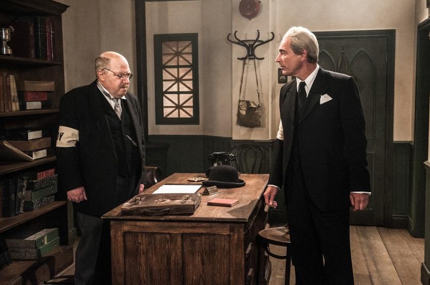 Stephen Russell’s script took the facts of the story and wove them into a comedy drama that touched and tickled in equal measure. At the heart of it was the partnership of David Croft and Jimmy Perry, one a producer barely tolerated by the bosses, the other a theatre actor of the old school who, in a hilarious opening sequence, flunked an audition with a disastrous array of hammy accents. His response was to write himself a part that, if commissioned, they’d have to cast him in. The Fighting Tigers was a terrible title but a brilliant idea about the splendid old codgers who were Blighty’s last line of defence against the fearful Hun. It was adopted fanatically by Croft, keenly by comedy boss Michael Mills, warily by light entertainment head Tom Sloan and with fierce reluctance by BBC1 controller Paul Fox. The higher the authority, the more conservative the instincts. (Pictured below: Richard Dormer and Paul Ritter as Croft and Perry.)