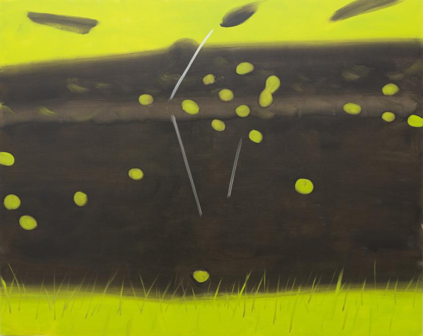 Black Brook, 2014, is sublime. Two bands of acid-green grass frame a horizontal band of deep-violet water that appears to have hidden depths. Dotted randomly over the darkness are clusters of light blobs; they could be floating leaves or reflections dancing on the surface. There’s no way of telling.