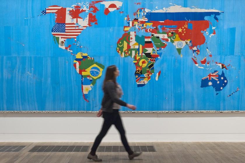 And how do you represent the world in a map? Various different projections prioritise one view over another by laying emphasis on the northern or southern hemispheres. For his maps – the ultimate example of “bringing the world into the world” – Boetti used several different projections and filled each country with its national flag. From 1971 until his death in 1994, he produced over 200 examples (see main picture) and, during that time, changes in the design reflect world events such as the break up of the Soviet Union and the civil war in Namibia, which was shown blank while the country had no national flag.