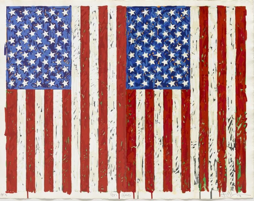 What is so striking and accessible about this multifarious display is the way artists embraced the quotidian, responded to events, subtly campaigned. The photorealists – Richard Estes, for example – turned sharp-focus photography on its head, showing with deadpan bravura ordinary shop fronts and signage, glittering with light from the plate glass of shop windows. Robert Rauschenberg used many sources including press photographs for montage mash-ups of political figures, space rockets and the like (pictured above right: Rauschenberg's Sky Garden from Stoned Moon, 1969. © Robert Rauschenberg Foundation/DACS). Jasper Johns, of course, with his superb sense of texture and colour took as his subject the sacred American icon, the flag (main image). There is an irony in turning it into a decorative object, almost a shocking sacrilege from an artist who could make of a beer can something dignified and important.