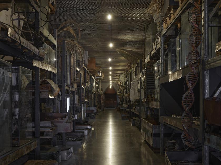The dark entrance passage way, now a staple of Kiefer’s Bermondsey installations, works as a kind of initiatory pathway, an entrance into the Underworld, evoking ghosts, dreams, corpses and the often strange magic of discards. This is part of what Kiefer calls his “arsenal”, his lifelong accumulation of resources which both inspire him and provide fuel for his work: there are heavily spray-painted clothes, hanging in sinister rows, displays of human and other bones in glass cases, abandoned suitcases that could contain filth or treasure, boxes full of stones, some of them silver and others gold – as in much of his work, a great deal of lead, an allusion perhaps to Saturn, the god of Time and constraint, the artist’s fetish dried out palms, sunflowers and poppies, recurring double helixes and slithering snakes, objects of many shapes and sizes, amulets used perhaps in rituals as yet un-invented, or perhaps long-forgotten. The display evokes the dusty reserves of an imaginary museum, as well as the otherworldly alleyways of the Palermo catacombs. This is a place that echoes with the limitations of mortality, as well the flights of the artist’s own imagination. A place of life as well as of death. A space in which to be startled and moved, as well as entertained.