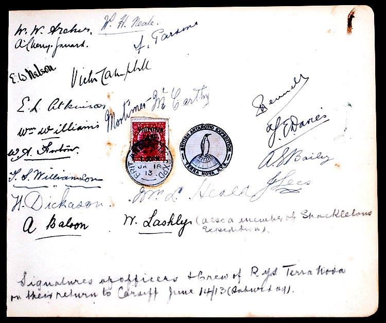 In honour of the Welsh contribution, Captain Scott made Cardiff the home port of the expedition, while Crown Patent Fuel, bowderlised blocks of coal, were supplied in easily stored chunks to fire the ship’s furnaces. A sample of it (pictured right) sits somewhat incongruously in a display case. The city made an impression on Scott’s men. “I don’t think we will ever forget Cardiff,” wrote Teddy Evans on 17 June 1910, the day of departure, in a letter which bears the signatures of several men whose names would go down in polar history - including Birdie Bowers and Edward Wilson. Some of Wilson’s pretty water colours of the southern continent are on display here, but his and Bowers’ names are poignantly absent from the card signed by the party of polar explorers returning to Cardiff three years later. The Terra Nova, stirring images of whose departure are also on display (pictured below), was met on the same dockside by the widowed Lady Scott three years later.