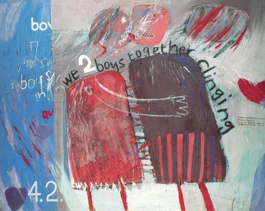 But this early period is noteworthy not just for Hockney’s visual inventiveness and comic wit, but because of the work’s frank sexual politics and overt homoeroticism. In his major paintings Hockney either depicts cheesy muscle-bound types of the sort found posing in tight underwear in health and fitness magazines, or are the Dubuffet-like figures of his edgier, more avant-garde oeuvre, including one of his most well-known, We Two Boys Together Clinging (1961), which quotes its lines from a Whitman verse celebrating gay love.