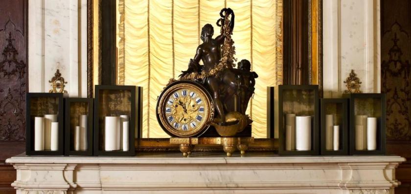 On the West Gallery mantelpiece, six black lacquer boxes lined with lead, the fascination of what’s difficult, all together contain in groups of two and three 16 porcelain vessels in celadon, white and a dash of gold glinting on some of the rims (pictured left). They embrace, three to a side, a demurely extravagant French clock, gilded, carved, cast, with flurries of naked putti cascading down the clock face, surmounted by a bronze nude holding out a golden garland.