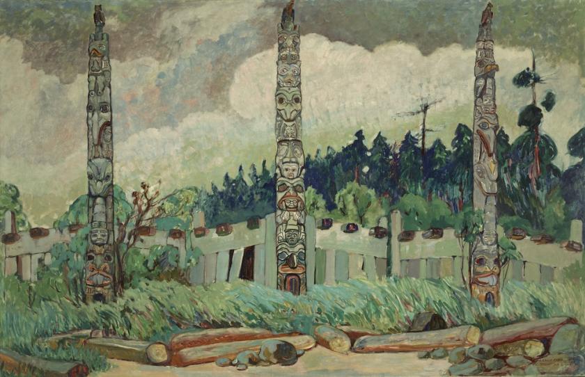 Having resolved a few years earlier to dedicate herself to recording the embattled native cultures of Canada’s west coast, Carr returned from Paris with a new energy. In watercolours of remote and often deserted settlements, Carr’s recent encounters with the Fauves are unmistakably evident. In Tanoo, Queen Charlotte Island, BC, 1913 (main picture), the bold, vigorous treatment of the overgrown grass and lush foliage contrast with the melancholy aesthetic of the piece. The forgotten totem poles, gradually being reclaimed by nature, are reminiscent of the picturesque ruins beloved of 19th-century English watercolourists.