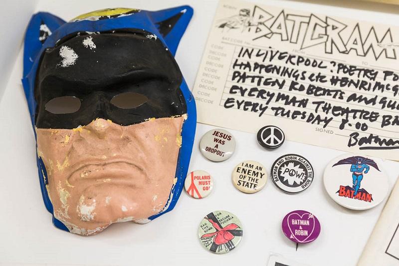 Large, bearded, black-spectacled, here he is, in black and white TV footage declaiming his ironic Batpoem to music from the Liverpool Scene, with his band: "Help us smash the Vietcong / Batman / Help us show them that they’re wrong / Batman / Help us spread democracy / Get them high on LSD / Make them just like you and me / Batman /." There’s his Batmask (main picture), along with a Batcomposition collage and a catalogue for a comic exhibition at the ICA in 1970 that featured Henri along with Jules Feiffer, Stan Lee and others. And an extraordinary painting, the Sgt Pepper-like Entry of Christ into Liverpool in 1964, is an homage to James Ensor’s Entry of Christ into Brussels in 1889, featuring Henri’s heroes and friends: Pere Ubu, William Burroughs, Charlie Parker, Charles Mingus, George Melly, and Patten and McGough among others.