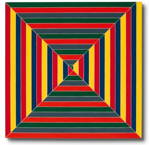 One of his responses was that instead of some false illusionistic manner of creating depth - painting the far-off man smaller - you had to give the canvas actual depth, make some layers sit further forward, some backward. Felstzyn III (1971) is on an adjacent wall, with its further-back green plane.