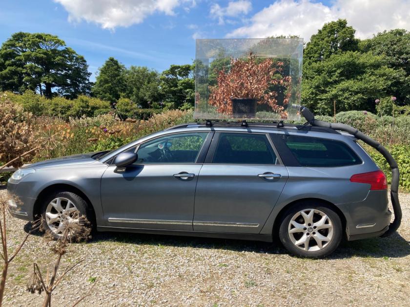 I’m standing now among exquisite gardens in a remote part of West Cornwall, looking at a second-hand estate car with a large Perspex box screwed to the roof, and a brown and patently dead plant inside. A tube looped over the back of the vehicle feeds its exhaust emissions into the box, so it kills its cargo (a griselinia littoralis, I’m told) as it moves. Parked among the billowing, meadow-like flower beds that surround the Kestle Barton gallery, it makes a stark and dead-pan monument to the automobile age and the intrinsic destructive capacities of the horseless carriage.