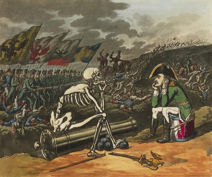 The print-shops flourished in Georgian London, and no stratum of society from the highest to the lowest was spared an appearance; the edginess and anger of some of the leading cartoonists are hardly matched even today. There is something of that when Rowlandson touches on the Napoleonic wars in his most edgy and disturbing image in The Two Kings of Terror, showing Napoleon and Death, as a skeleton, together after the Emperor’s defeat at Leipzig.